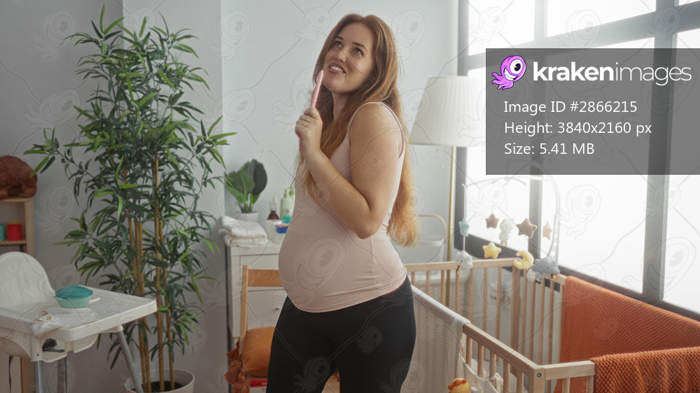 Woman holds her pregnant belly and sings into a toothbrush while dancing in studio; anticipation nurturing joy bonding.