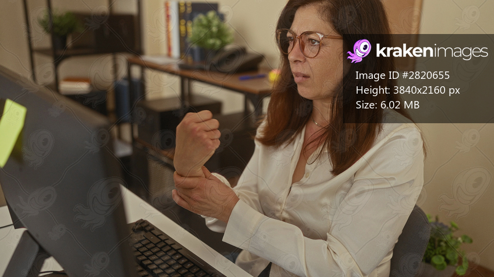 Woman holds her wrist beside a keyboard and a computer monitor at a desk in a building while wearing eyeglasses; pain.
