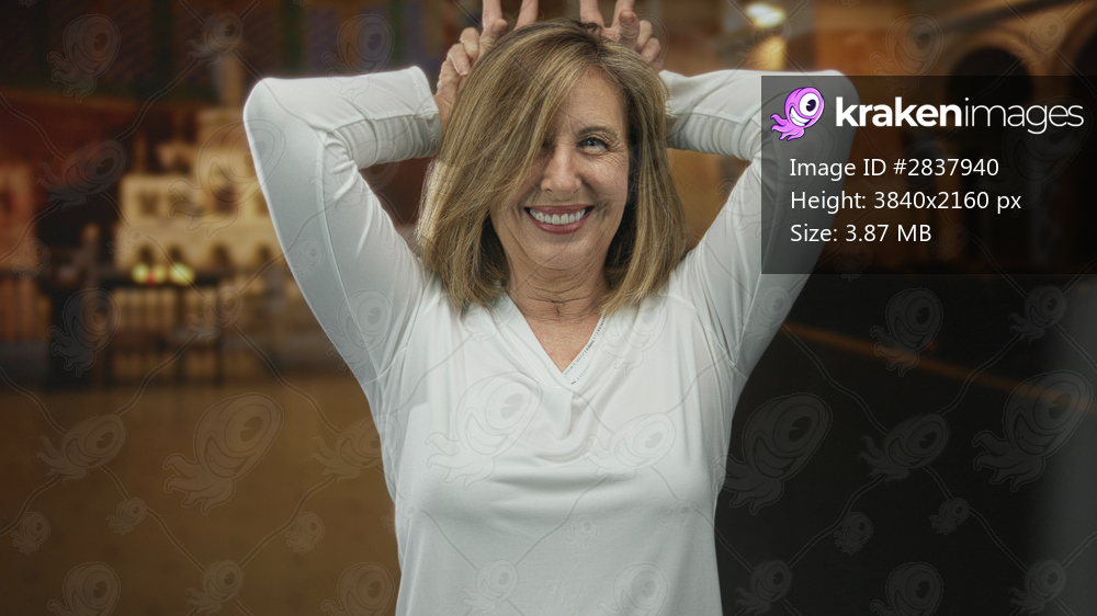 Woman holds horns gesture with fingers amid pew and altar details in church while smiling broadly; playful joy.