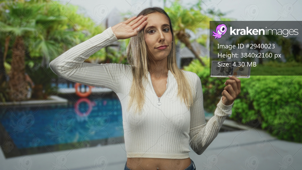 Woman holds hundred dollar banknote at pool beside building with arm across forehead shielding eyes; summer money relaxed.