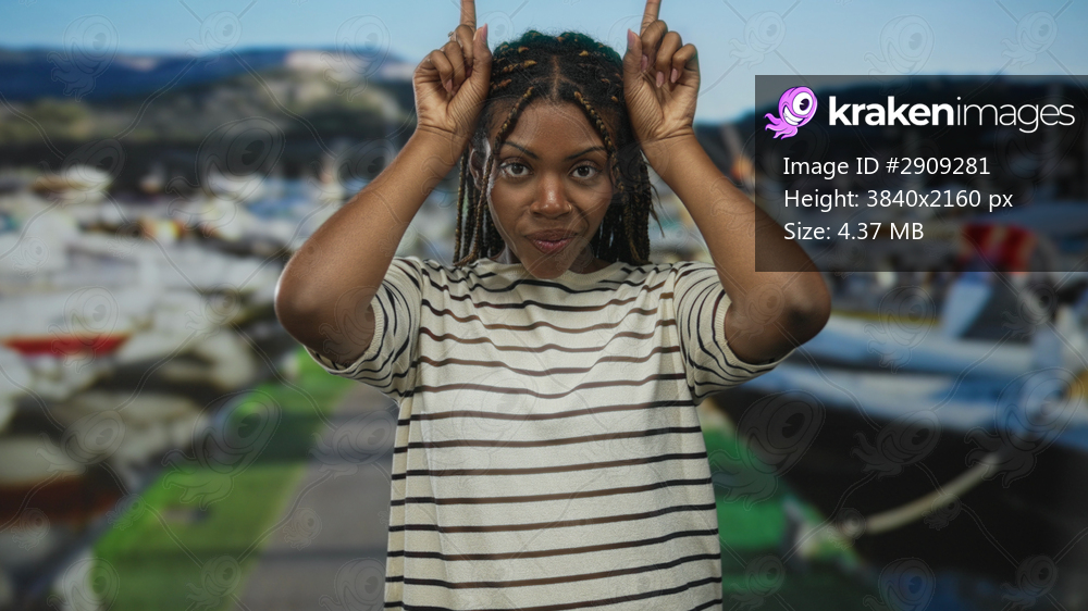 Woman holds index fingers up by head at a marina port area, hands and forearms visible; playful mischief.