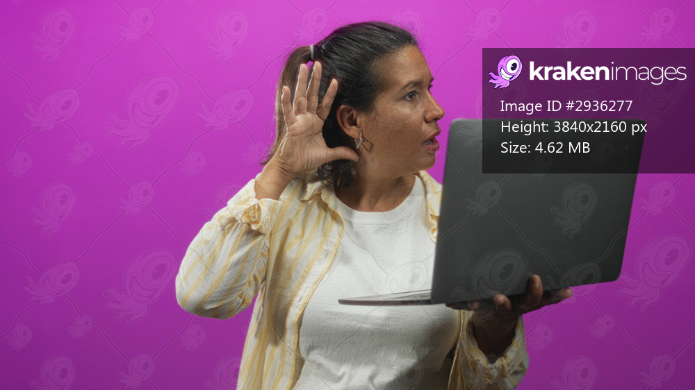 Woman holds laptop with one hand and cups her other hand to her ear while peering at the screen against a magenta studio backdrop; confusion curiosity. - Kraken Images