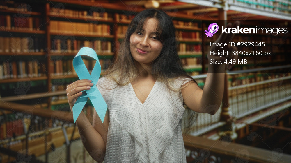 Woman holds large blue ribbon with fingers in a peace sign gesture in library building; awareness hope.