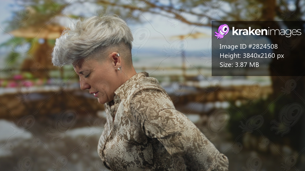 Woman holds lower back at a sunlit outdoor restaurant terrace with tables and umbrellas during midday; backache discomfort.