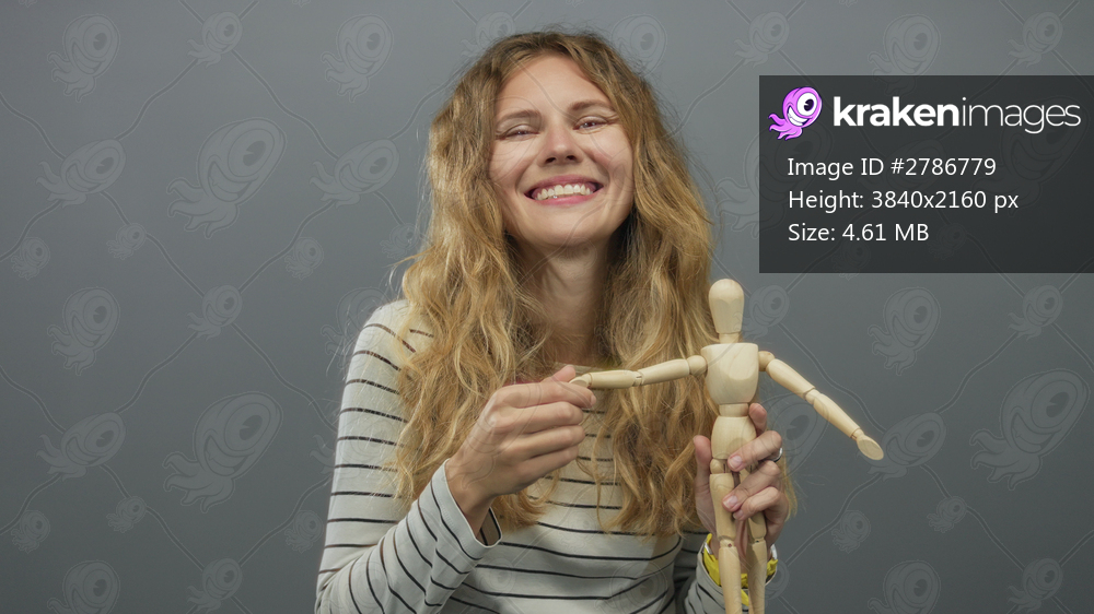 Woman holds mannequin while smiling in studio with blonde young hair framing a wooden posing figure and adjusting its casual posture.