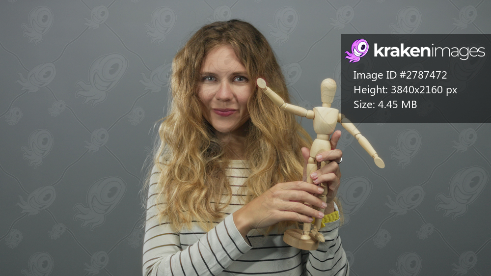 Woman holds mannequin while smiling in studio with blonde young hair framing a wooden posing figure and adjusting its casual posture.
