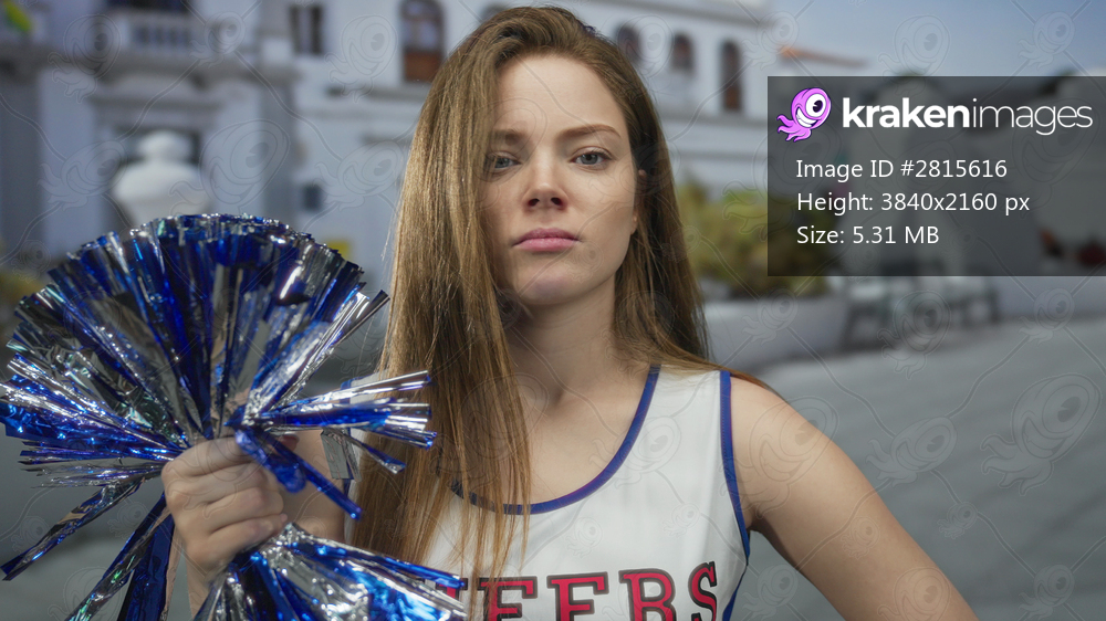 Woman holds metallic blue pompom with clenched fist on city street pathway under daylight wearing white uniform top; disgust.
