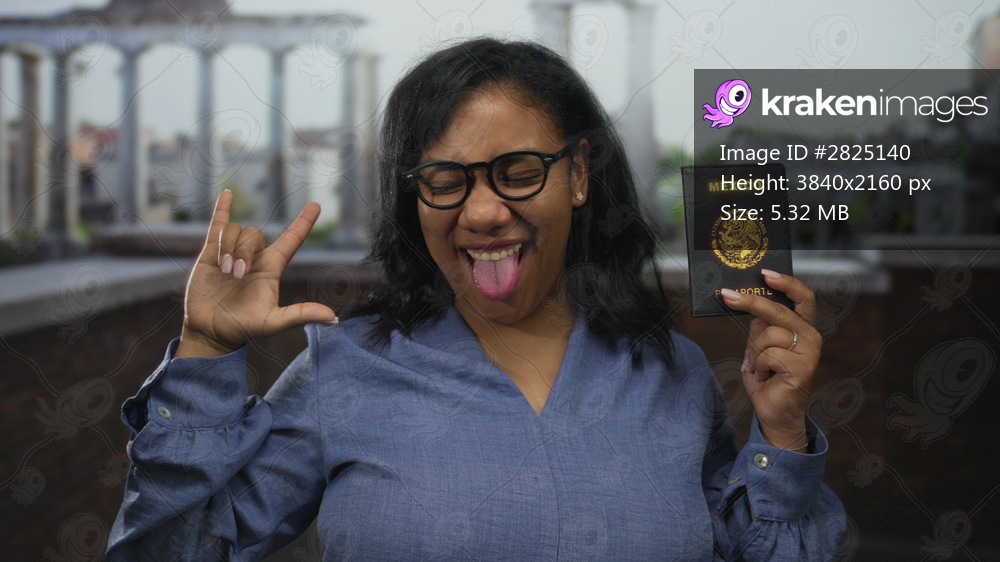 Woman holds mexican passport and shows rock horns gesture amid ancient ruins with a broad smile; travel adventure.