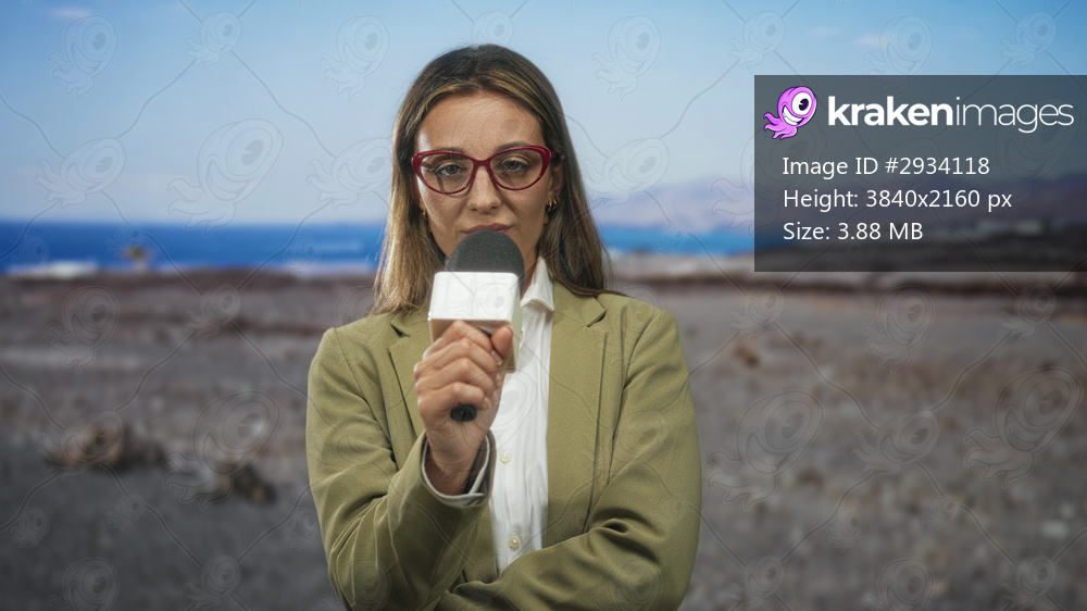 Woman holds microphone with arm extended on street by the coast while facing camera and wearing red glasses and blazer; confident news reporting.