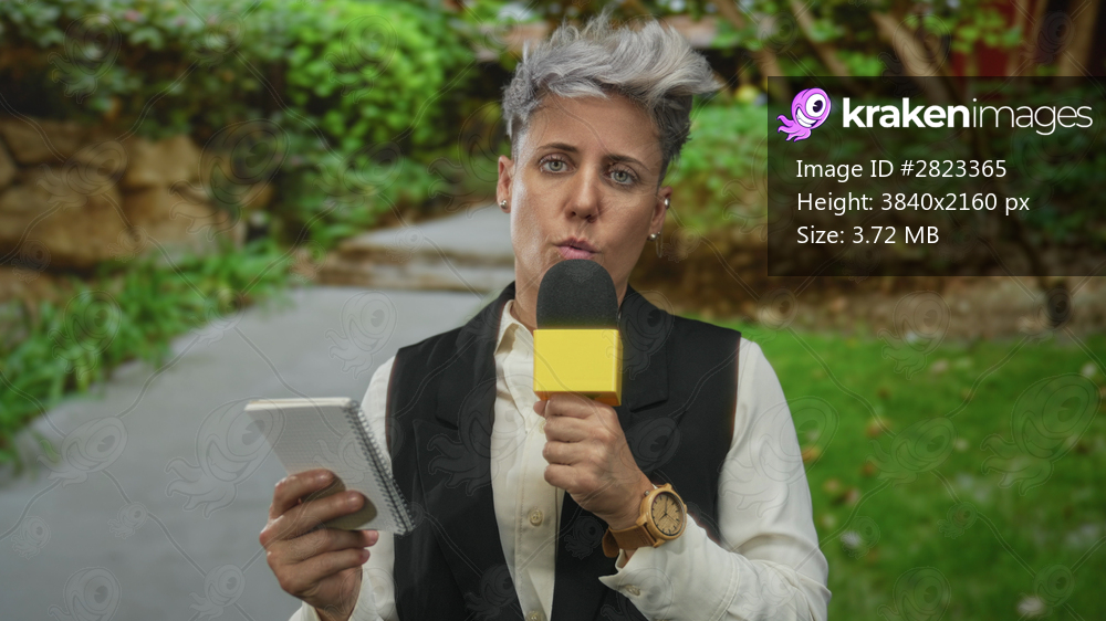 Woman holds microphone and notepad amid dense green foliage in forest while speaking; calm reflection.