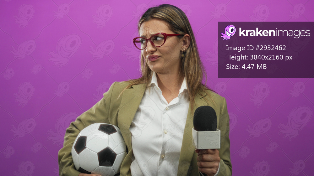 Woman holds microphone and soccer ball in studio with vivid purple backdrop, furrows brow and makes a doubtful face while reporting; skepticism.