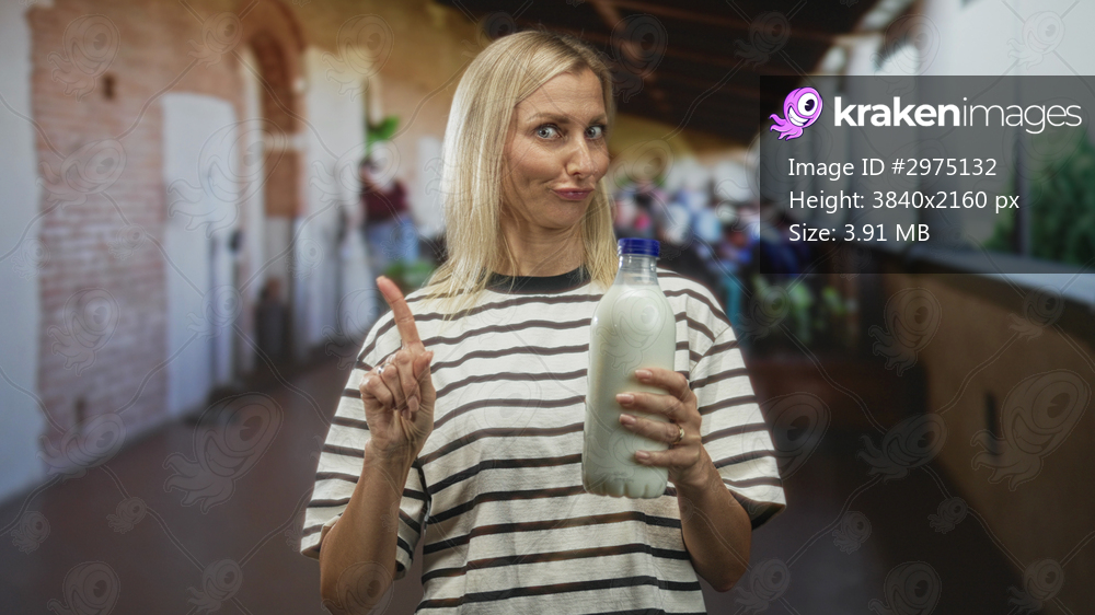 Woman holds milk bottle and points index finger in a building corridor; healthy choice skeptical nutrition.