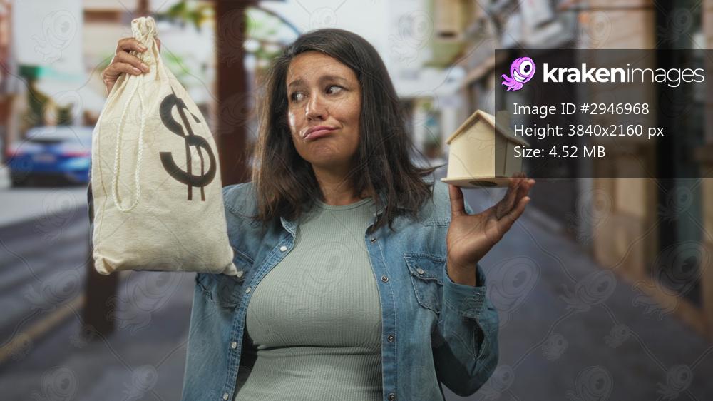 Woman holds money bag in left hand and wooden house in right hand, hands raised in comparing gesture on a street lined with buildings; financial dilemma uncertainty. - Kraken Images