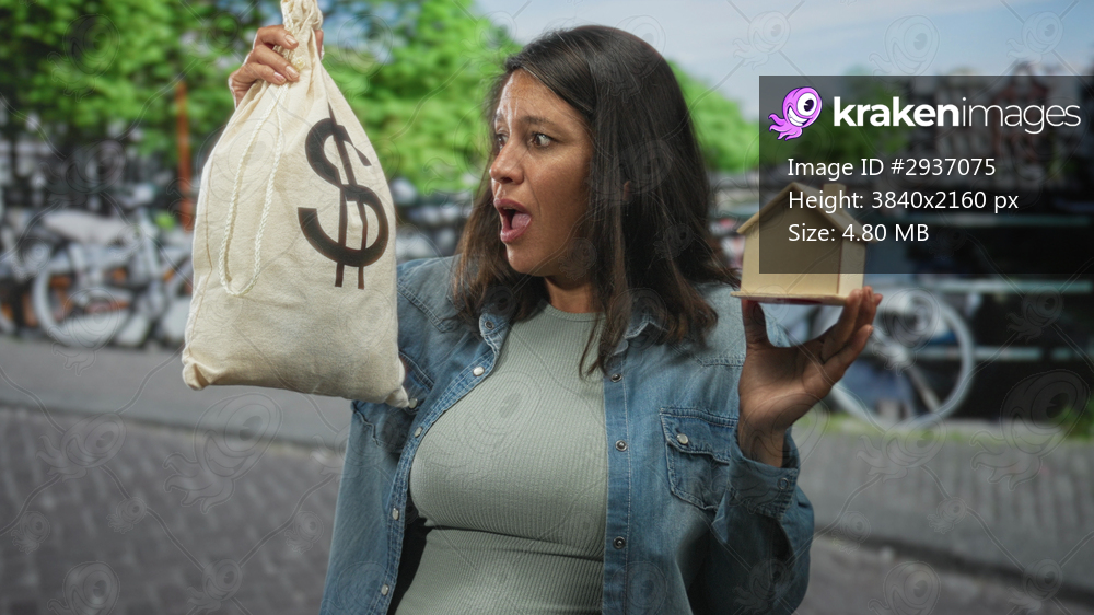 Woman holds money bag up and balances small house model with other hand on street, weighing choice between cash and home; uncertainty.