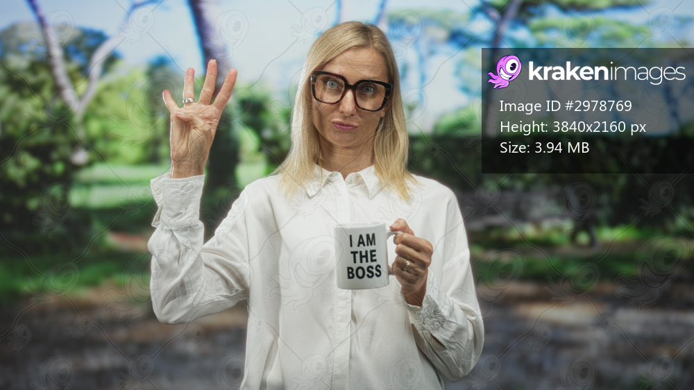 Woman holds mug that reads i am the boss, waves right hand and smiles in a forest setting; confidence leadership.