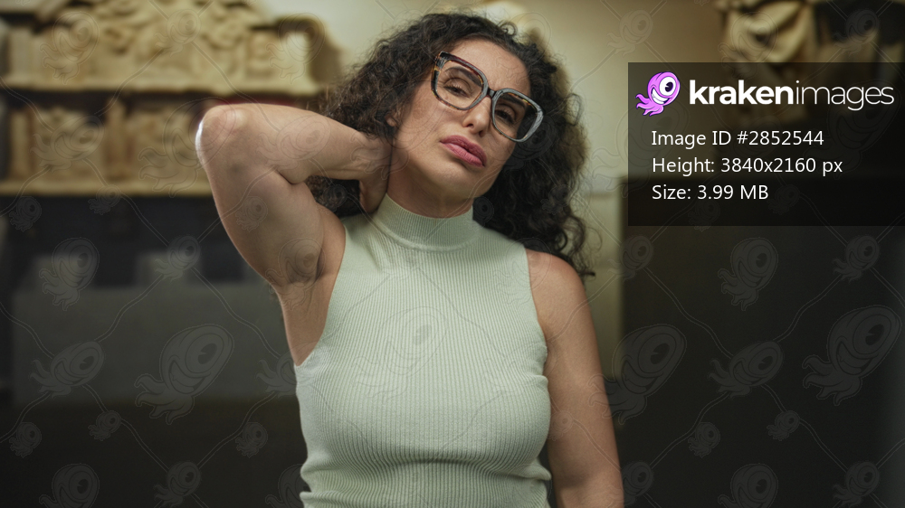 Woman holds neck wearing glasses with curly hair in green tank top among stone sculptures in museum gallery; discomfort.