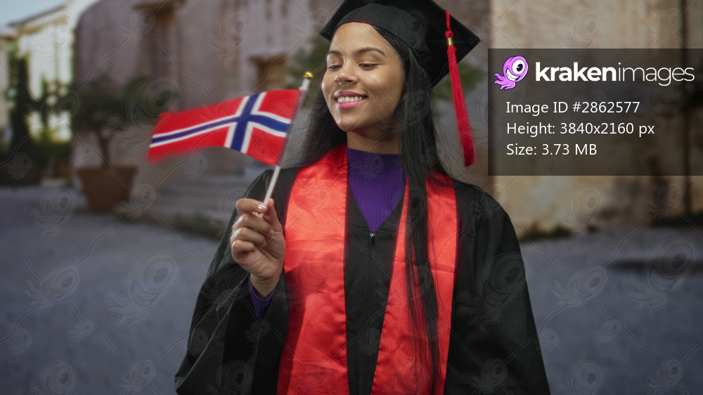 Woman holds norwegian flag on cobblestone street near historic building facade; national pride celebration.