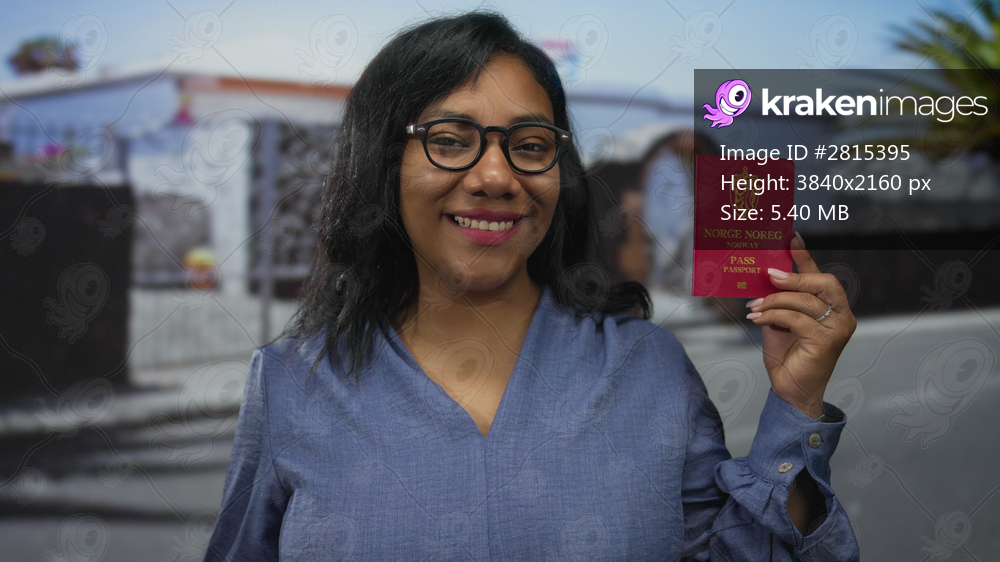 Woman holds norwegian passport with a smile on street lined with palm trees during daytime; travel freedom.