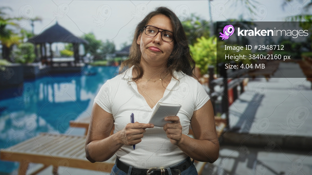 Woman holds notepad and pen at a pool by building, looks up and tilts head while wearing glasses and casual top; contemplation.