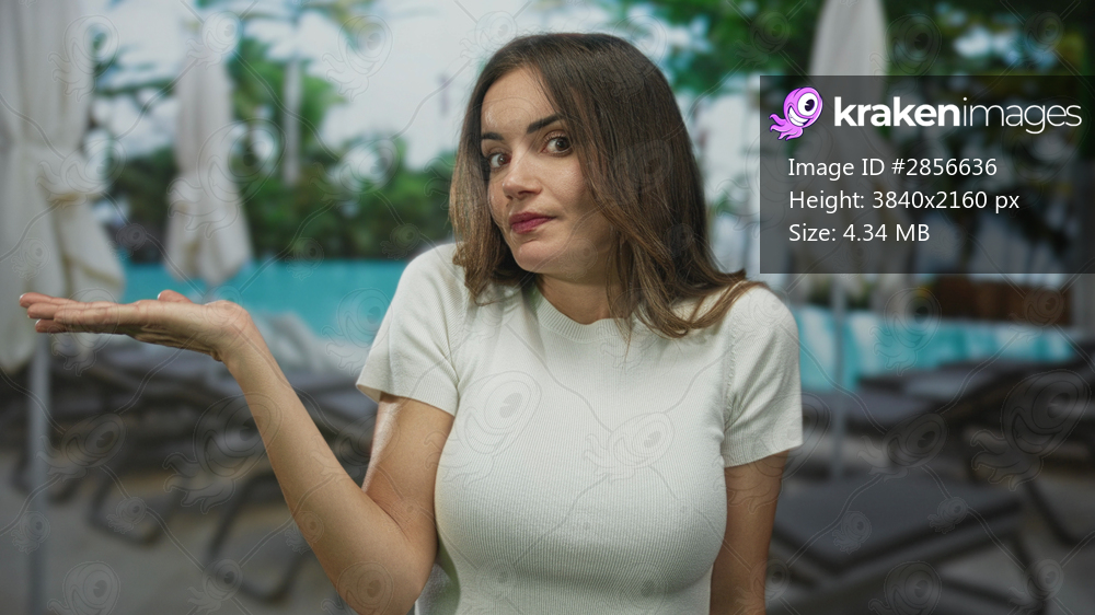 Woman holds open palm by hotel building at a resort pool beside white lounge chairs and folded umbrellas; serenity.
