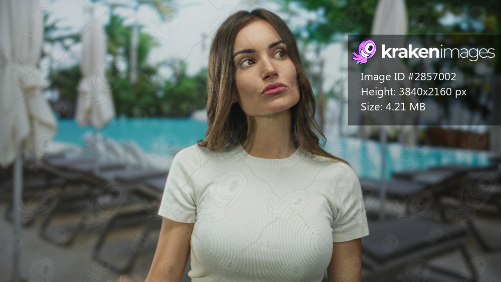 Woman holds open palm by hotel building at a resort pool beside white lounge chairs and folded umbrellas; serenity.