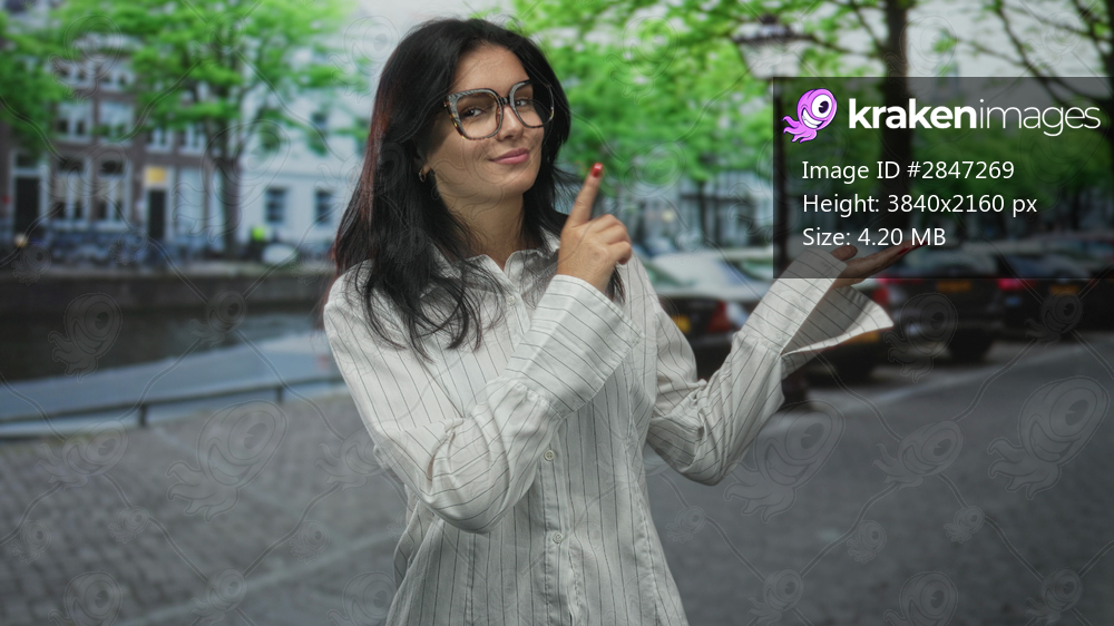 Woman holds open palm and points index finger toward urban canal street scene while wearing glasses; curiosity.