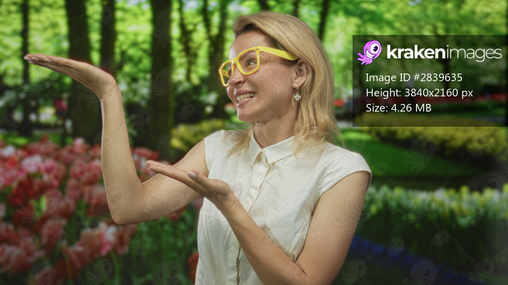 Woman holds open palms above blooming tulips in green park on sunny day; serenity renewal growth harmony.
