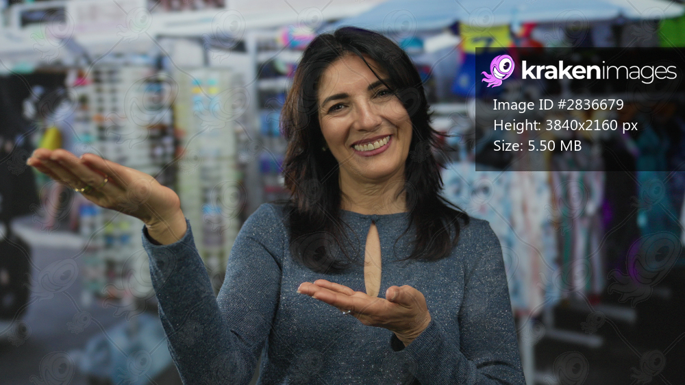 Woman holds open palms at outdoor souvenir market street stall while smiling broadly; warmth.