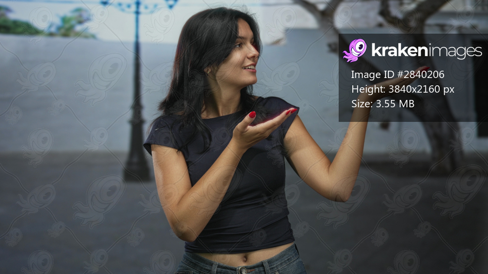Woman holds open palms up on cobblestone street while wearing black crop top and denim jeans under evening light; warmth.