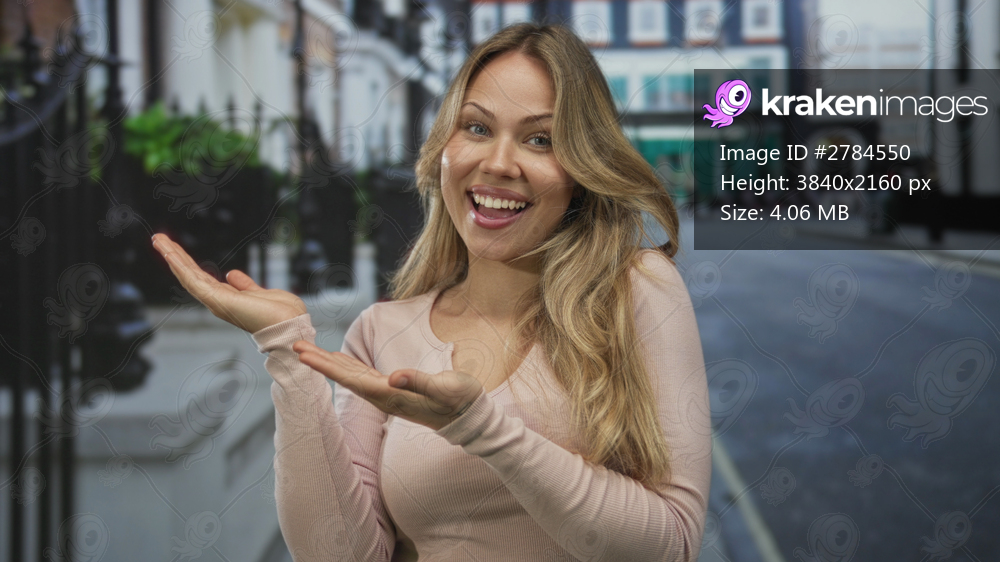 Woman holds open palms upward on a city street lined with townhouses during daytime; presentation curiosity optimism engagement.