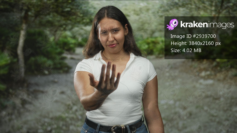 Woman holds out hand palm up on a forest path, reaching forward with extended fingers and a furrowed brow; hesitation request connection.