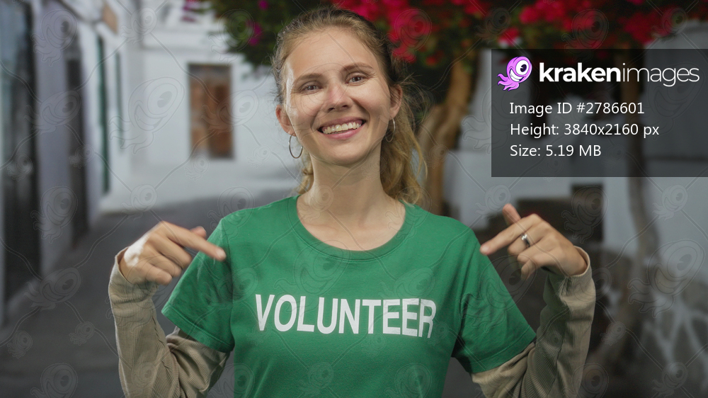 Woman holds out hands pointing towards a white street while a blonde young volunteer in a green shirt shows a warm smile and brushes hair behind ear.