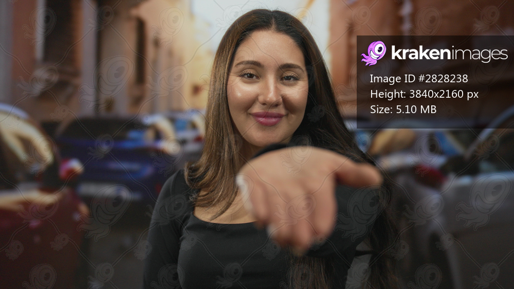 Woman holds out her palm in offering gesture on sunlit city street, smiling warmly toward the viewer; invitation trust.