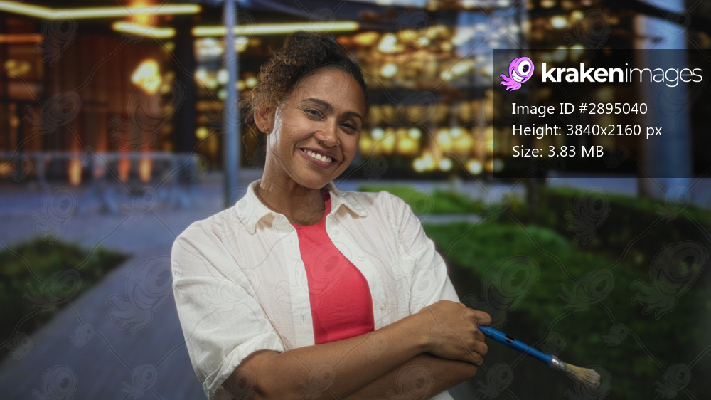 Woman holds paintbrush across chest on street by illuminated building facade, smiling with folded arms; confidence creativity.