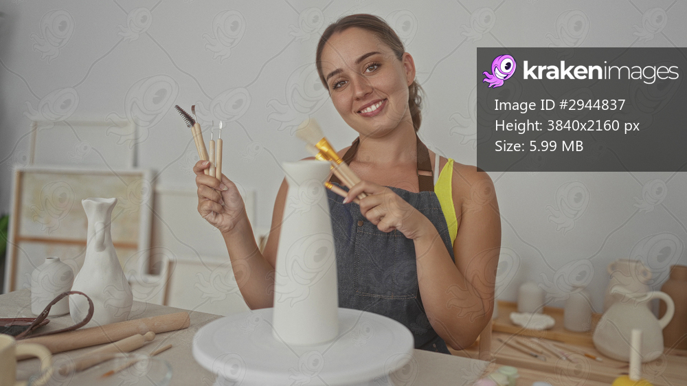 Woman holds paintbrushes and clay sculpting tools with both hands beside a pottery wheel in studio while smiling; creative joy.