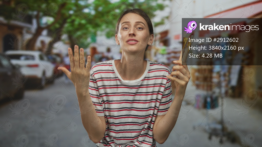Woman holds paintbrushes in right hand and lifts left hand with closed eyes on a busy street market; creative expression serenity.