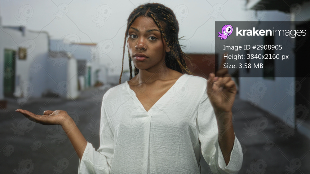 Woman holds palm up in front of white mediterranean buildings on a quiet street, braided hair and loose white blouse visible, looking down at her hand; contemplation. - Kraken Images