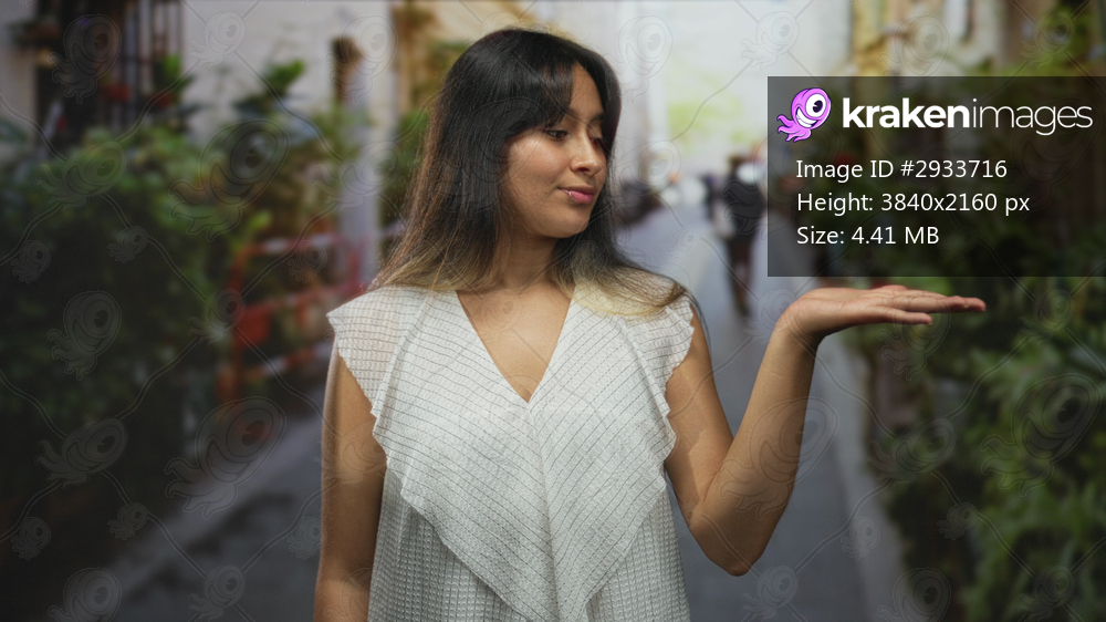 Woman holds palm up and points index finger on a narrow city street lined with plants; skepticism curiosity.