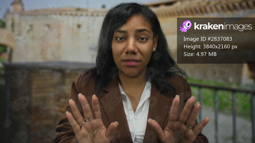 Woman holds palms forward for stop in old town street by stone building facade with serious gaze; caution.