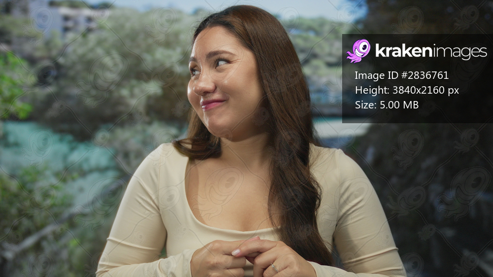 Woman holds palms up in shrug in forest clearing by calm river under late afternoon sunlight and green foliage; uncertainty.