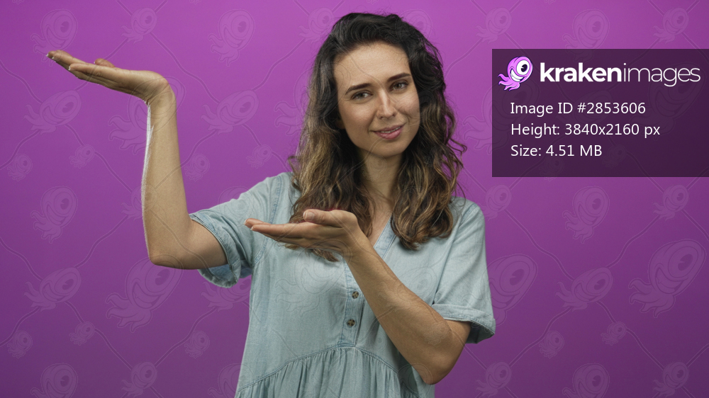 Woman holds palms up and tilts her head with a gentle smile in a purple studio capturing a welcoming gesture and open posture; happiness.