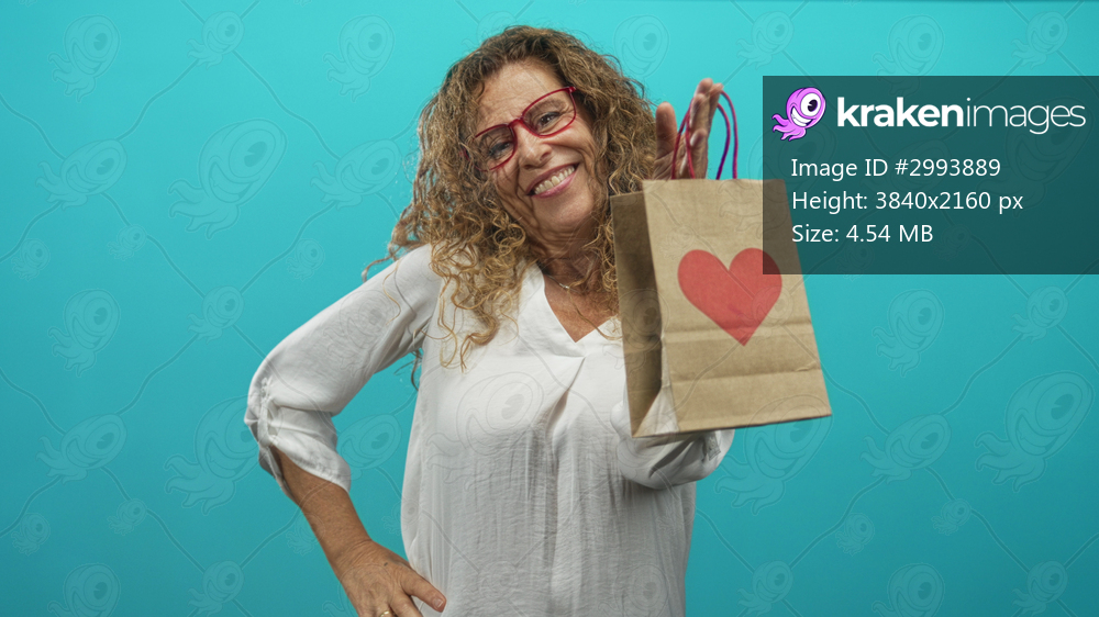 Woman holds paper gift bag with red heart emblem by hand, smiling and posing against a turquoise studio backdrop; warm love joyful.