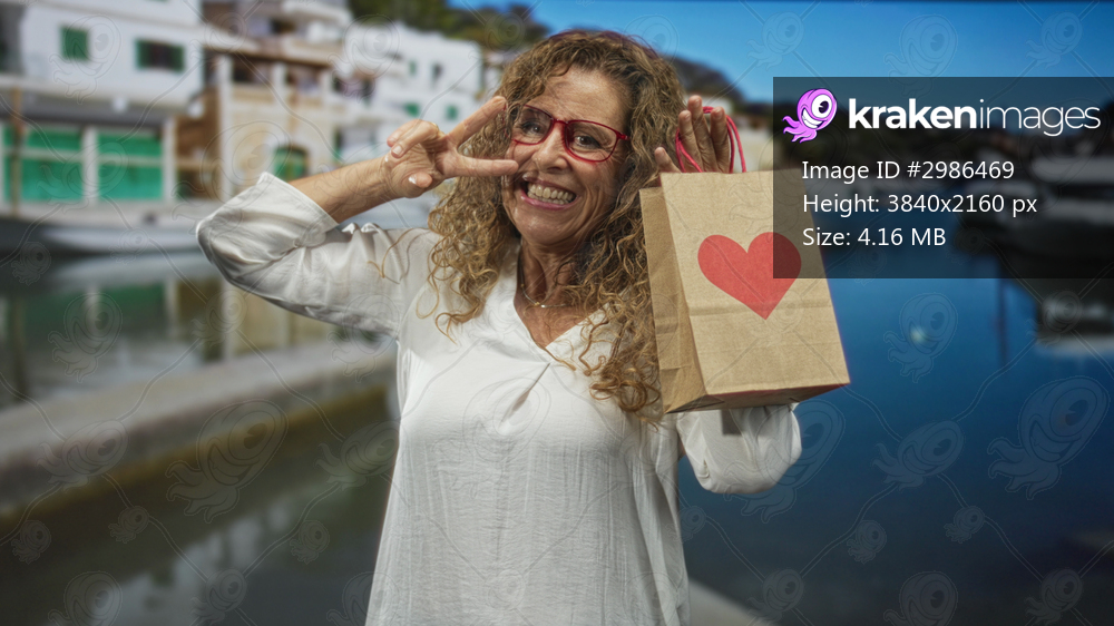 Woman holds paper gift bag with red heart and makes peace sign in front of waterfront building; celebration joy.