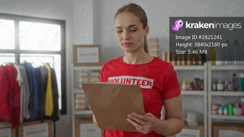Woman holds paper heart inside donation center building while reading from clipboard; charity kindness.