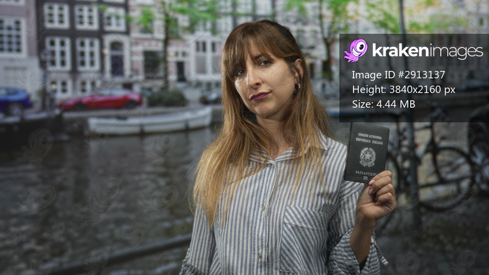 Woman holds passport on street in amsterdam with visible hand and neutral expression near canal and bike rack; travel independence confidence.