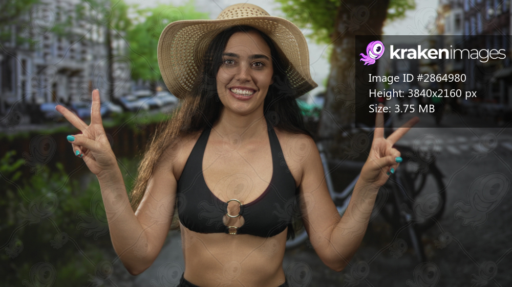 Woman holds peace sign and adjusts straw hat on a sunlit tree-lined street near canal and bicycles; urban summer happiness.