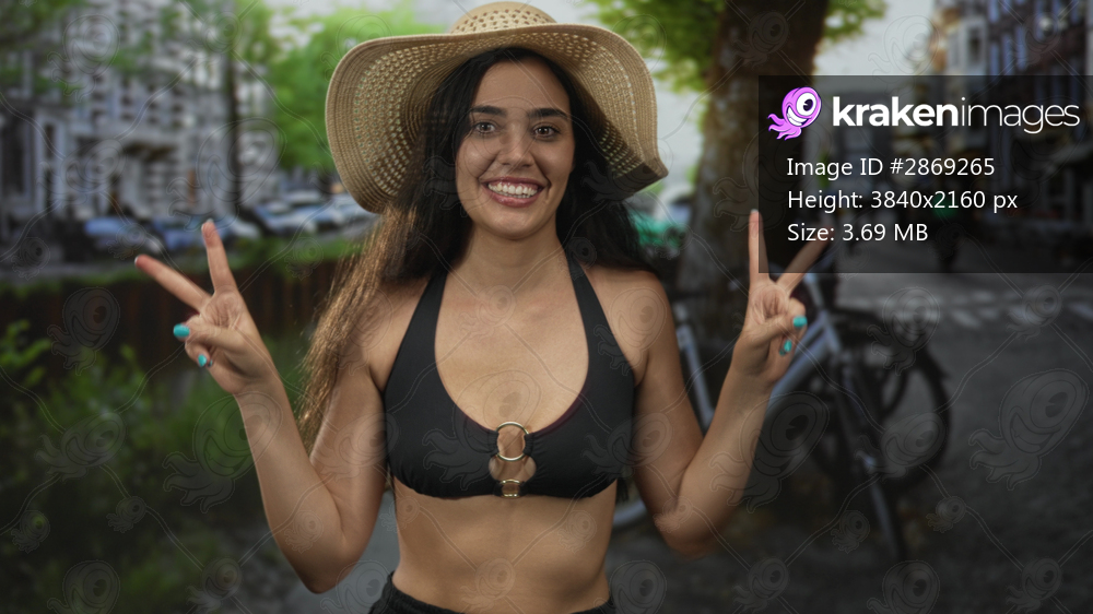 Woman holds peace sign and adjusts straw hat on a sunlit tree-lined street near canal and bicycles; urban summer happiness.