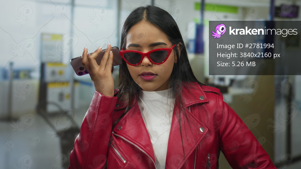 Woman holds phone sending info at airport while young latin hispanic tourist waits in terminal indoor corridor capturing audio.