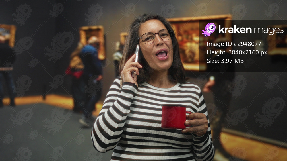 Woman holds phone to ear and a red mug while puckering lips in a museum gallery beside framed paintings and visitors; playful moment.