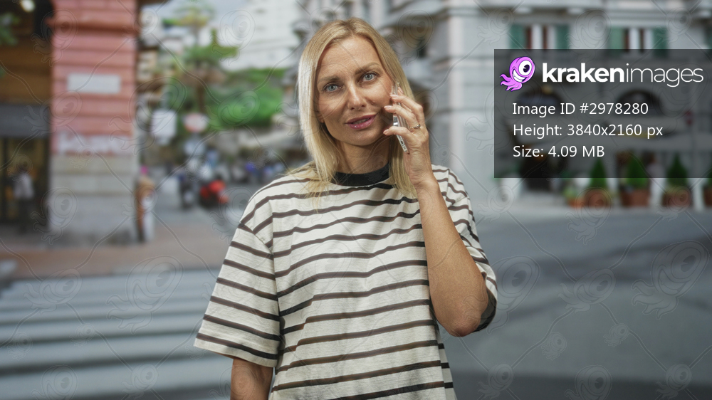 Woman holds phone to ear at street crosswalk near cafe awnings and city buildings, striped shirt visible; calm conversation.